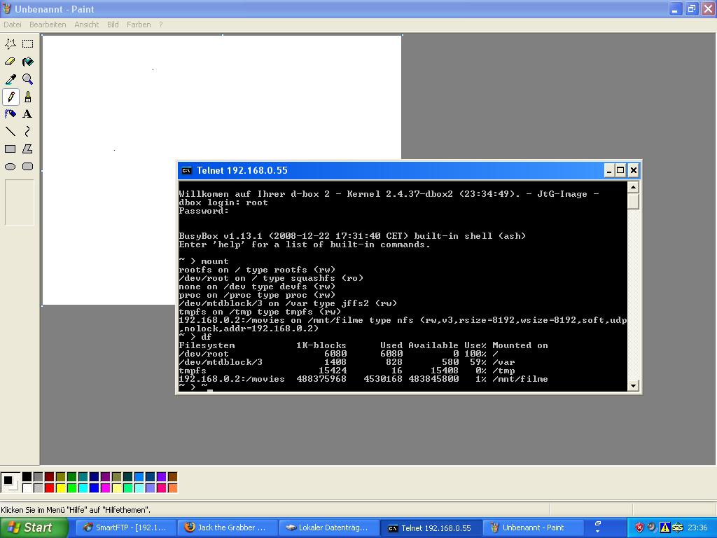 . Ich habe auch Problem mit dem Mounten. Wenn ich meine Verzeichnisse mit der dbox mounte, gibt es keine Fehlermeldung aber Zugriff zu den gemounteten Verzeichnissen habe ich nicht. Muss nachher zu Hause noch mal schauen, wenn passiert wenn ich "netcount" eingebe und mal per Hand mounte. Kann ich dann auch mit einem Befehl checken, ob gemountet wurde?
