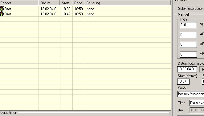 TIMERLISTE: sendung ist eingetragen, im Datum steht 8.2.2004 0